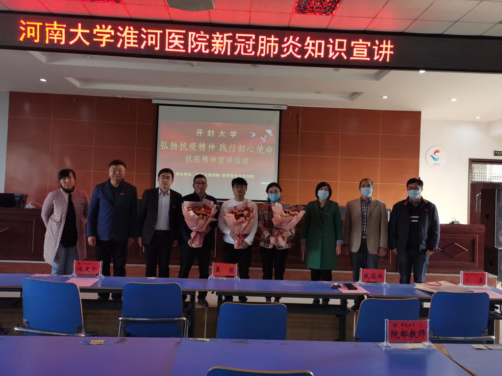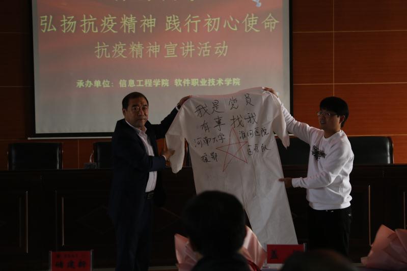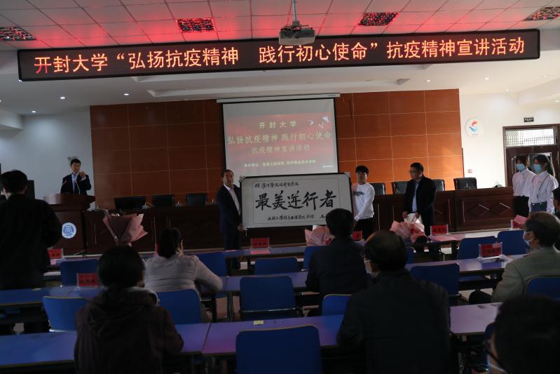 宣讲活动在激昂雄壮的国歌声中开始。与会来宾、领导和师生共同默哀悼念在抗击新冠疫情斗争中牺牲的烈士和逝世同胞。储书记代表学校向李国杰、盖颖、戚冠斌医生的莅临表示了热烈的欢迎,向戚冠斌医生一起白衣执甲、逆行出征的医护人员们表达了崇高的敬意,并号召老师们和同学们学习戚冠斌医生等抗疫战士的英雄精神;学习他们对党和人民的坚定信念;学习他们勇于担当、无私奉献的可贵精神;学习他们坚持不懈、埋头苦干的精神品质;学习他们攻坚克难克敌制胜的过硬本领,自觉的把“小我”融入“大我”积极磨炼,锻炼能力,争当先进、勇建新功,以不懈的奋斗为青春增添一抹亮丽的底色,以优异的成绩向建校40周年献礼。储建新向河南大学淮河医院援鄂医疗队赠送了书法家撰写的牌匾,淮河医院援鄂医疗队向365英国上市集团官网捐赠援鄂医疗队队员签名的医护服。