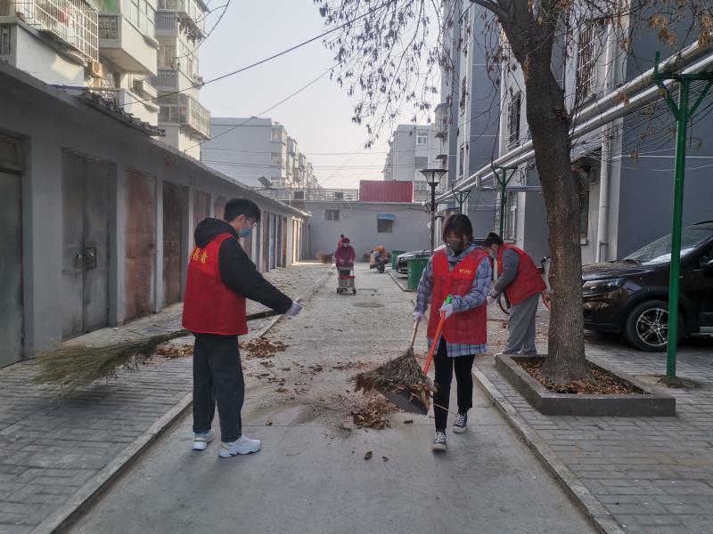 在主题党日活动中,顺河区团委武昕书记、苹果园办事处王主任与学生党支部的师生们一同在庄严的党旗下重温了入党誓词,共同学习了习近平总书记重要讲话精神。在入党誓词和习近平总书记重要讲话精神的激励下,主题党日活动后,师生们分为四个小组走进苹果园办事处下辖的四个社区进行了义务劳动。由于这四个社区刚刚进行了老旧小区改造加之近期天气寒冷,尘土和落叶垃圾较多。师生们充分发挥党员先锋作用,践行志愿者精神,在两个多小时的志愿服务活动中,将刚刚进行了老旧小区改造的四个社区打扫的更加整洁,受到了社区居民的交口称赞。