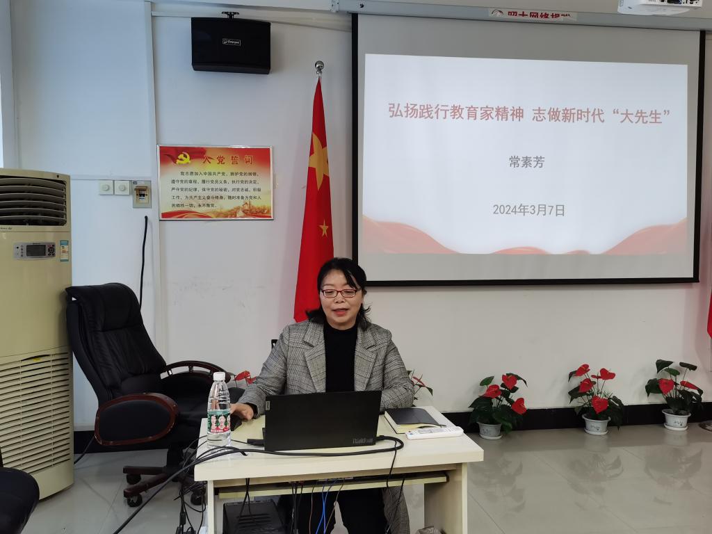 3月7日下午,信息工程学院全体教师在院会议室参加了主题党日系列活动启动仪式。首先,院党总支书记袁震从活动开展的意义讲起,习近平总书记对教师队伍建设提出了新的更高的要求,也为每位教师的发展成长指明了方向。接着,校党委宣传部部长常素芳教授给老师们上了第一课----《弘扬践行教育家精神,志做新时代“大先生”》。她引经据典,旁征博引,娓娓道来,用汪品先、卢永根、张桂梅等一个个鲜活的案例,生动阐述了作为高校教师如何构建课程思政育人格局,加强师德师风建设,弘扬教育家精神。最后,院长张新成总结,这是一堂生动的党课,一堂有意义的思政课,更是一堂让每位教师深省的人生之课。希望每位教师以德立身,做好课程建设,把立德树人的初心落实到每一堂课中,印刻在每一位学生心中。