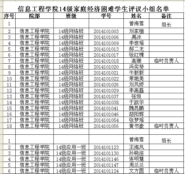 信息工程学院14级家庭经济困难学生评议小组名单