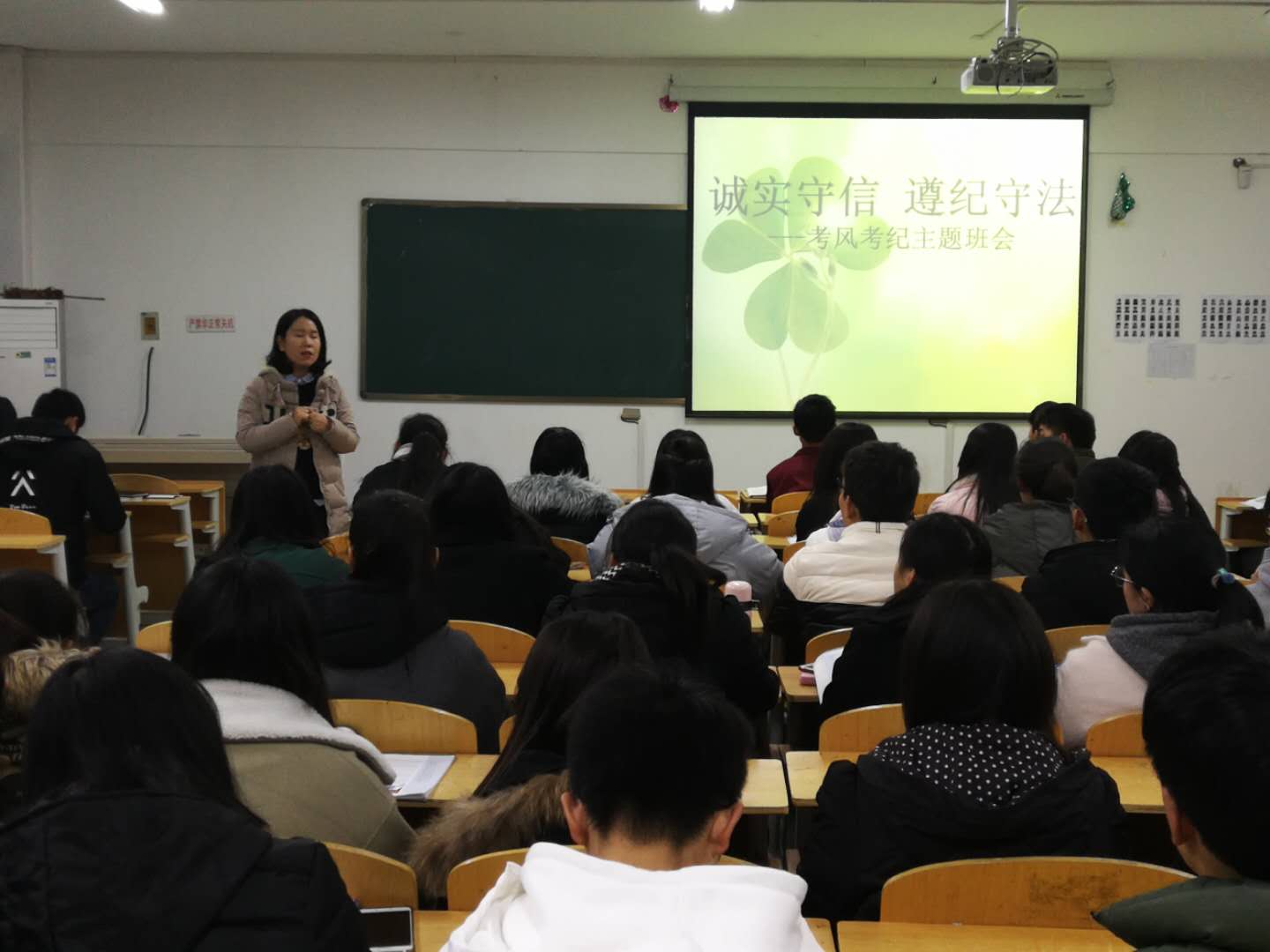 本站讯 期末考试临近,为严肃考风考纪,加强诚信教育,同时在寒假假期即将来临时对学生进行必要的安全教育,12月25日晚,信息学院2017级全体学生在3号楼401、402、403教室召开了考风考纪暨假期安全教育主题班会,会议由辅导员张娜娜老师主持。
