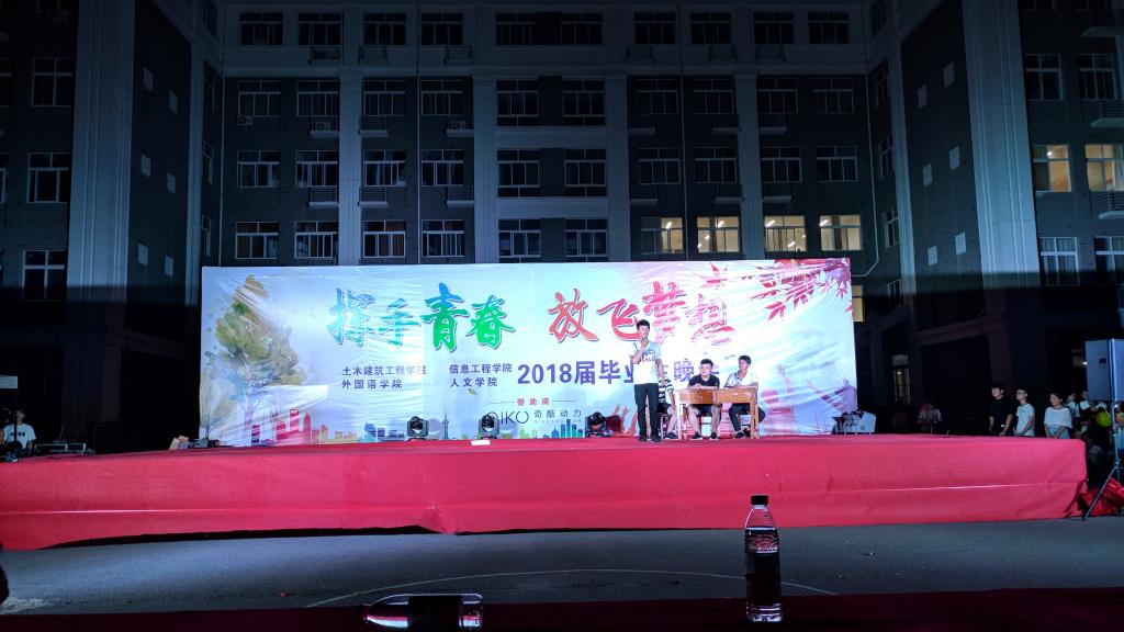 2018年6月6日晚,信息工程学院与土木工程学院、外国语学院、人文学院联合举办的“挥手青春,放飞梦想”毕业生晚会在365官网篮球场举行。