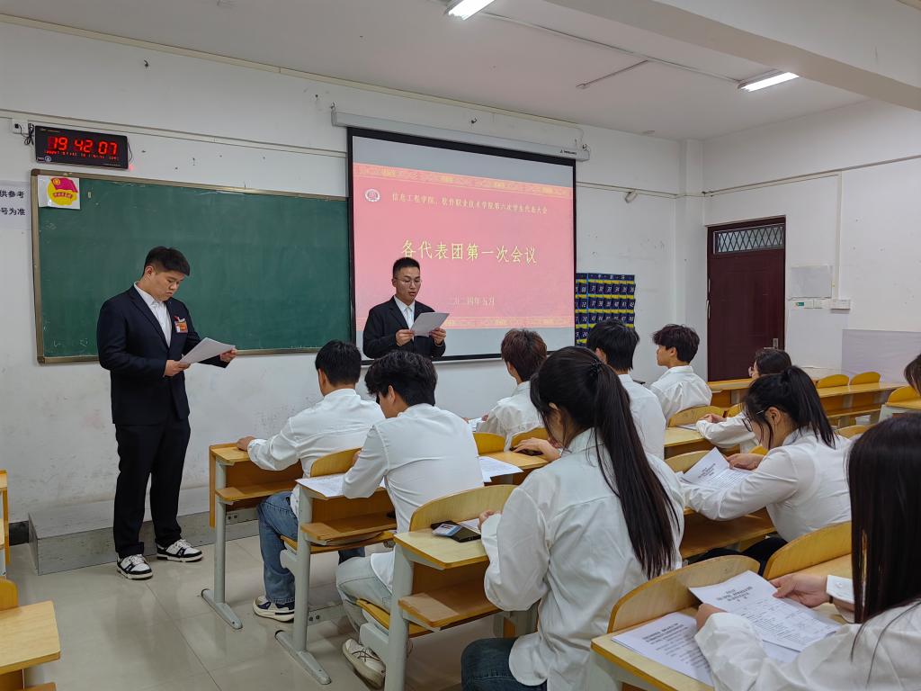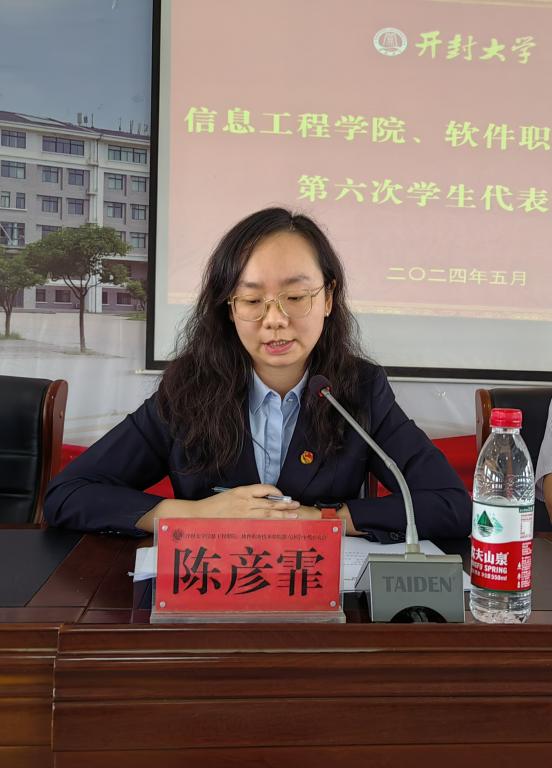 在雄壮的国歌声中,大会正式开幕。陈彦霏代表校团委对大会召开表示热烈祝贺,希望大会即将选举产生的新一届学生委员能够带动好学院学生会组织牢记习近平总书记对广大青年给予的希望,与时俱进,加强自身建设,充分发挥桥梁和纽带作用,为推进学校“双高”建设做出新的更大的贡献。李红礼代表学院党总支致题为《坚守群团组织的底色 发扬抓铁有痕的韧劲塑造学生会组织的新面貌、新形象》的开幕词,提出了三点期望,希望学院学生会在今后的工作中,以习近平新时代中国特色社会主义思想为指引,把牢政治方向,引导学院青年学子坚定不移跟党走;聚焦主责主业,坚持从严治会,巩固改革成果;做实“我为同学做实事”品牌,助力学院青年学子全面发展。黄河水院信息工程学院学生会主席赵书帆代表兄弟院校学生会宣读了贺信;学院学生会执行主席祁映嘉代表第五届学生会委员会作题为《党建引领谱新篇 扬帆奋进正当时》的学生会工作报告,总结了自学院上次学代会以来,学院学生会组织坚持“党建工作引领高水平建设 团建工作带动高质量发展”工作格局所取得的成绩和存在的不足,号召同学们坚定不移听党话、跟党走,实学实干,脚踏实地、埋头苦干。在攀登知识高峰中追求卓越,在肩负时代重任时行胜于言,在真刀真枪的实干中成就一番事业。