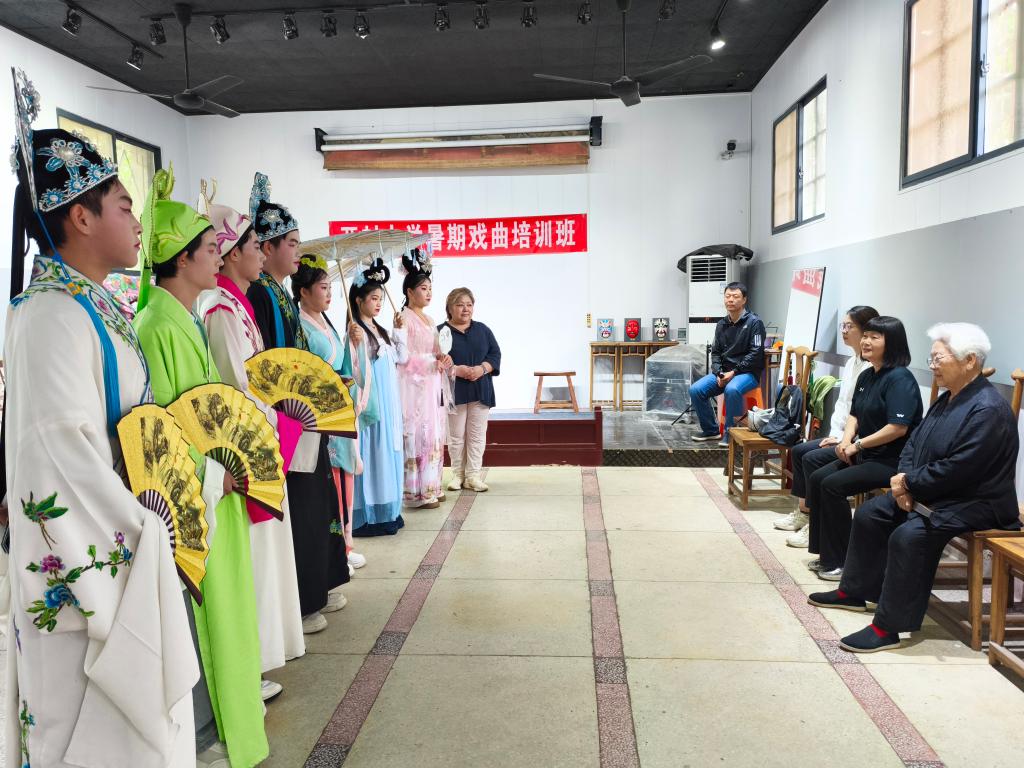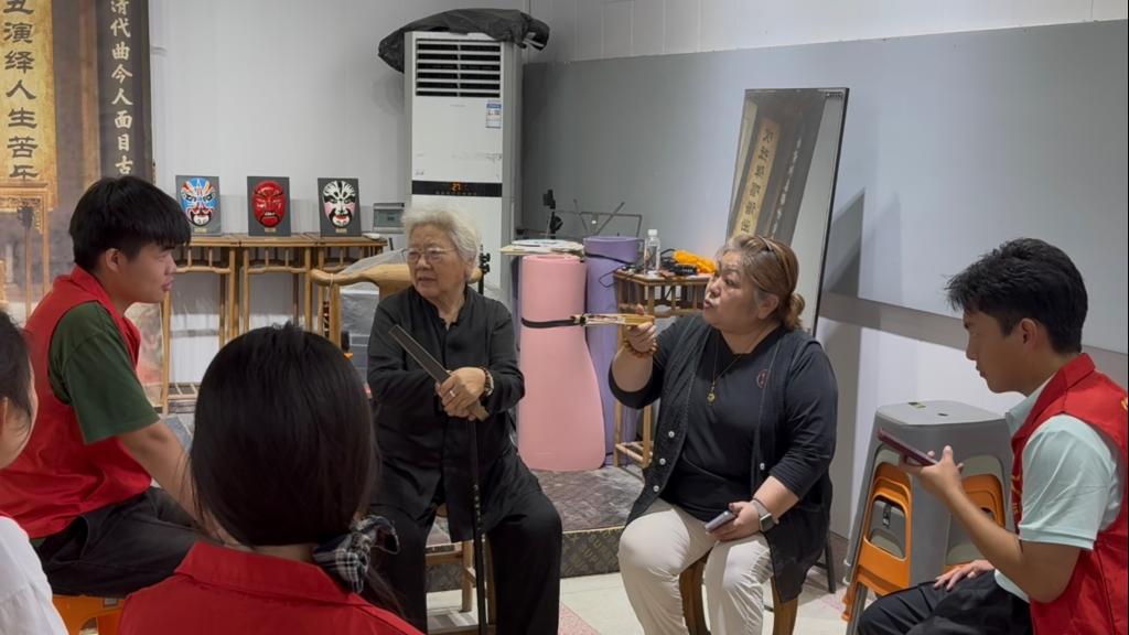 在非物质文化遗产研学社会实践活动中,实践队的同学们在开封市文广旅局的大力支持下,前往开封市爱国主义教育基地——“田爱云二夹弦剧团”,在以往基础上继续深入开展“二夹弦技艺专题研学活动”。国家级非物质文化遗产二夹弦代表性传承人田爱云,与吴筱曼、吴小玲两位老师教授同学们戏曲步伐、礼仪及基础唱腔,并指导大家演唱新时代唱段《最是风雅书店街》。同学们在大师们的指导下,对二夹弦的历史与发展,以及如何发挥自身力量去促进黄河流域非物质文化遗产保护与传承,有了更新的认识。