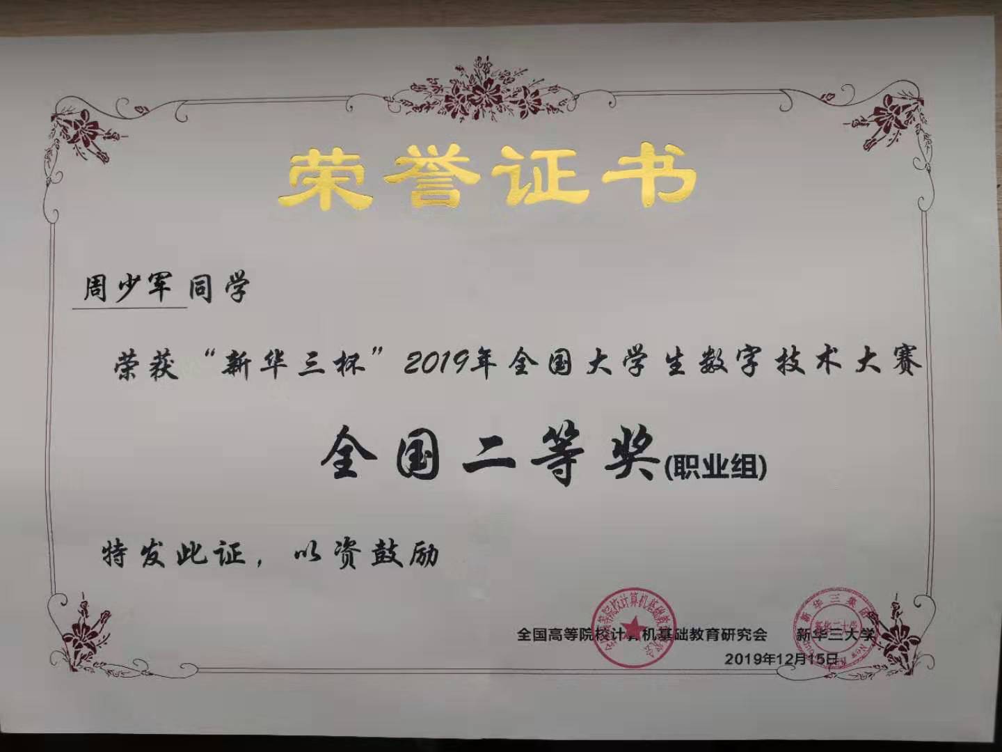 本站讯 12月15日由全国高等院校教育研究会等单位主办的“新华三杯”2019全国大学生数字技术大赛在浙江经贸职业技术学院落下帷幕,信息工程院计算机网络专业周少军同学获得高职组二等奖。