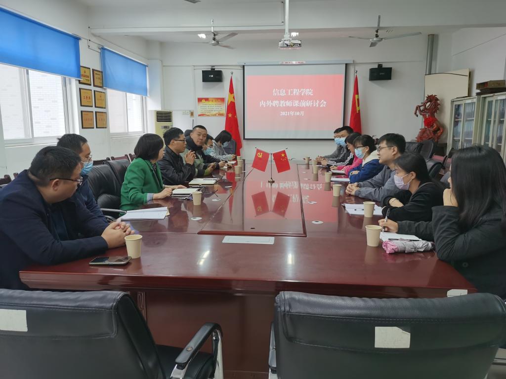 本站讯 10月7日上午,信息工程学院在学院会议室召开了内外聘教师座谈会,就2021级新生教学工作进行深入交流。院长杨桦、教学副院长张才千、教科办主任付红杰和10多位内外聘教师代表参加了此次座谈会。会议由教科办主任付红杰主持。