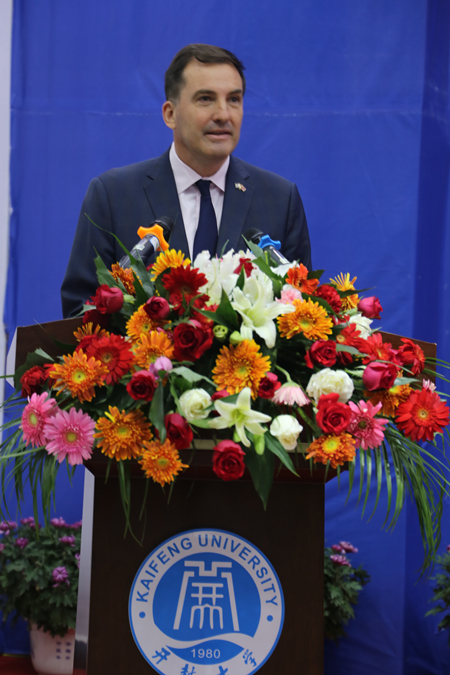 此次电影周开幕式是河南省“乌拉圭周“系列活动之一,正值开封市第38届菊花文化节期间,也恰逢365官网建校40周年之际。开幕式上,校党委书记陈灿代表全校师生发表了热情洋溢的讲话,向远道而来的大使表示了热烈的欢迎,向长期以来关心支持365官网发展的省、市领导以及各界人士表达了衷心的感谢。