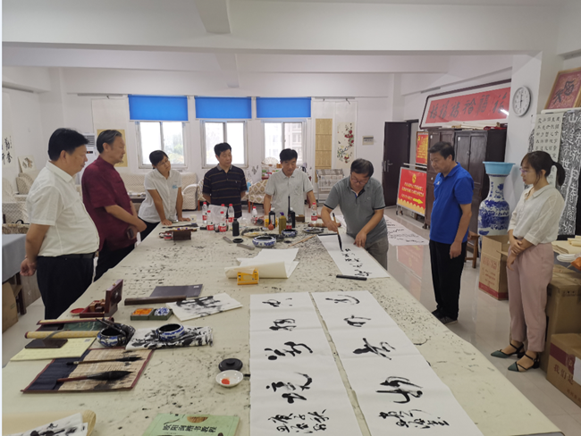 本站讯 9月16日下午,开封市文联秘书长郭张开,开封市书法家协会副主席郭思源,中国书法家协会会员、甲骨文钧瓷龟甲片创始人傅伟华,中国书法家协会会员、中国文艺家艺术研究院院士崔向前一行莅校调研指导文化建设工作。365官网校长宋志敏,校工会、艺术设计学院相关负责人及工作人员陪同调研。
