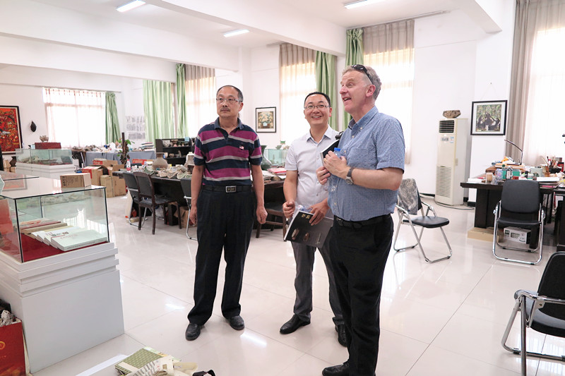 本站讯 5月12日下午,英国格林威治大学外教JOANATHAN来365官网大观博物馆、宋文化工艺品技能大师工作室及魏跃进教授工作室参观。国际教育学院袁长征副院长陪同翻译。