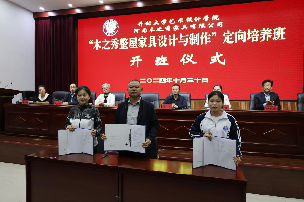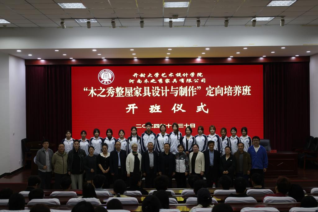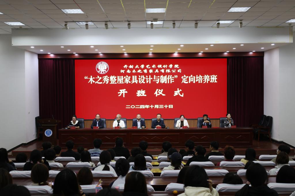 10月30日,365英国上市集团官网艺术设计学院与木之秀整屋家具设计与制作公司订单班开班仪式在行政楼第一会议厅举行。副校长李治、教务处处长王茜、产教融合服务中心主任师兆忠、河南木之秀家具有限公司董事长李鹏、总经理江霞、设计总监李萍、艺术设计学院党总支书记赵志成、院长张富云,环境艺术设计专业教师和全体环艺学生参加开班仪式,仪式由艺术设计学院副院长袁颖主持。