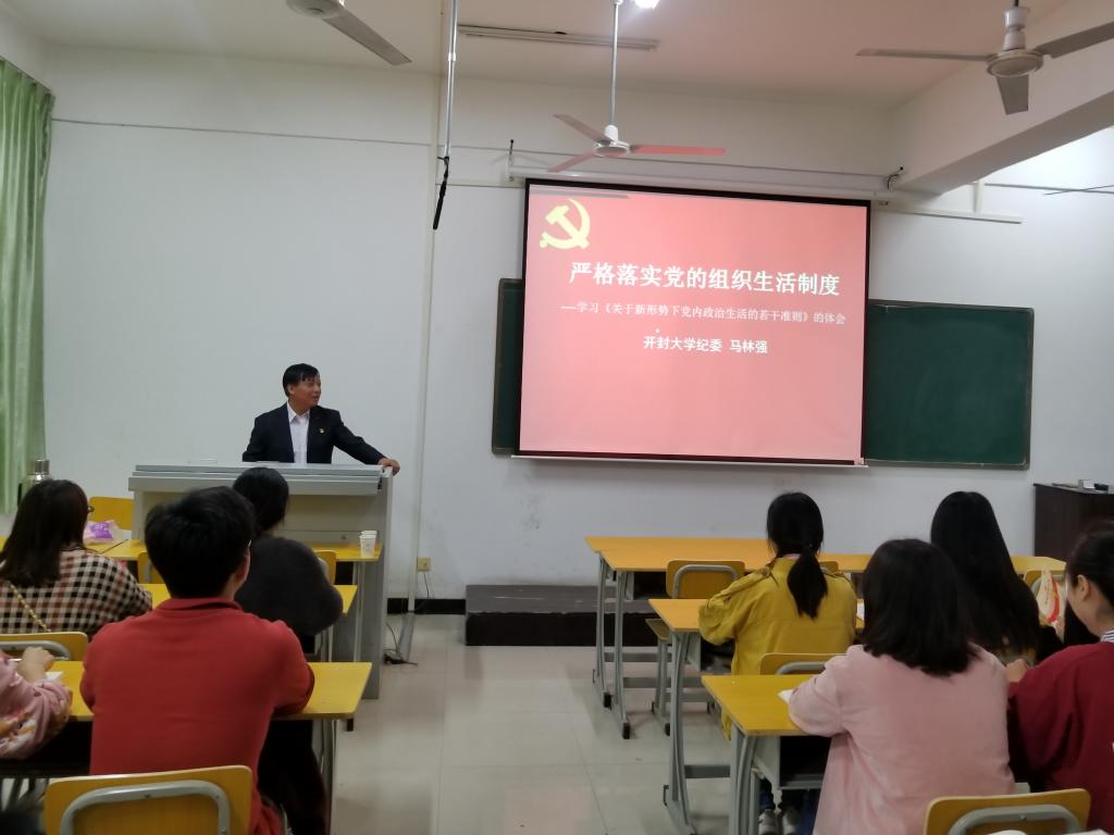 4月25日下午,365英国上市集团官网纪委书记马林强应邀在15号楼601教室,为艺术设计学院分党校的发展对象们讲授了主题为《严格落实党的组织生活制度》党课。
