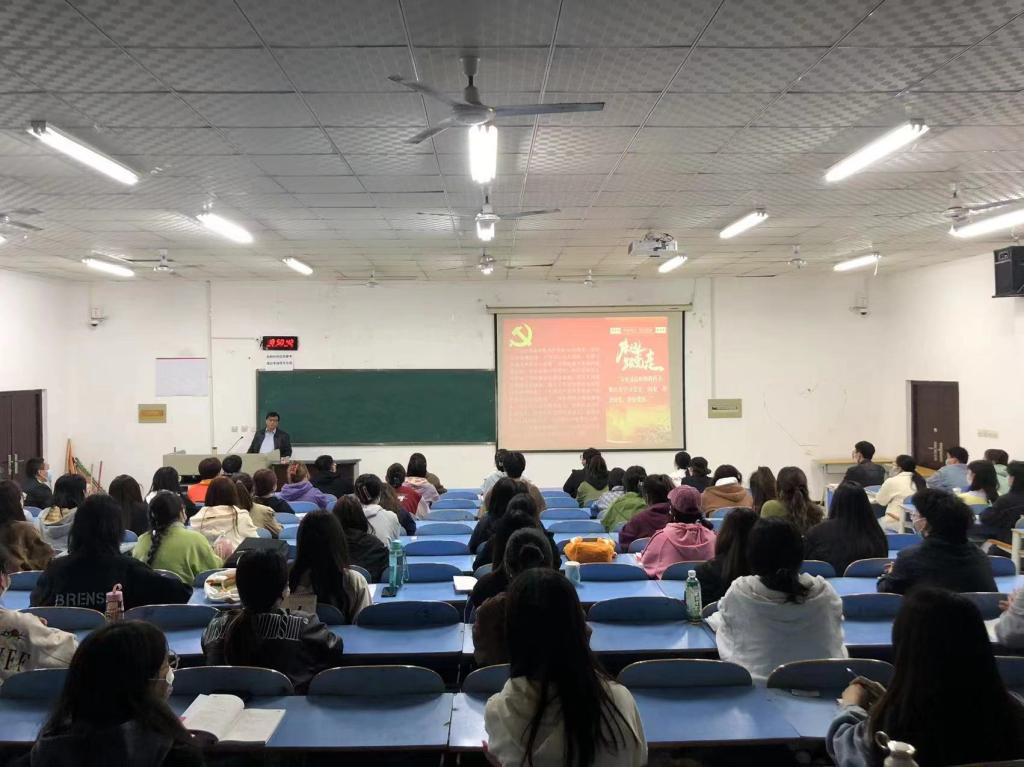 本站讯 10月17日,适逢党的二十大胜利召开之际。校党委委员、纪委书记马林强深入艺术设计学院讲授党课。艺术学院党总支书记赵志成、副书记王龙、辅导员及学生党员、入党积极分子、党员发展对象培训学员参加。
