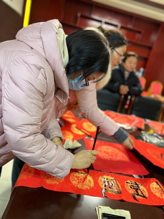 上午10点,活动正式开始。老师们挥笔洒墨为居民写下一张张“福”字、一副副春联。吉祥如意的春联、红红火火的“福”字,表达了老师们对景龙社区居民的美好祝福,更为迎接新春佳节增添了一份浓浓的年味。社区群众纷纷驻足观赏,对各位老师的精湛技艺连连称赞,现场气氛被烘托得格外火热和喜庆。