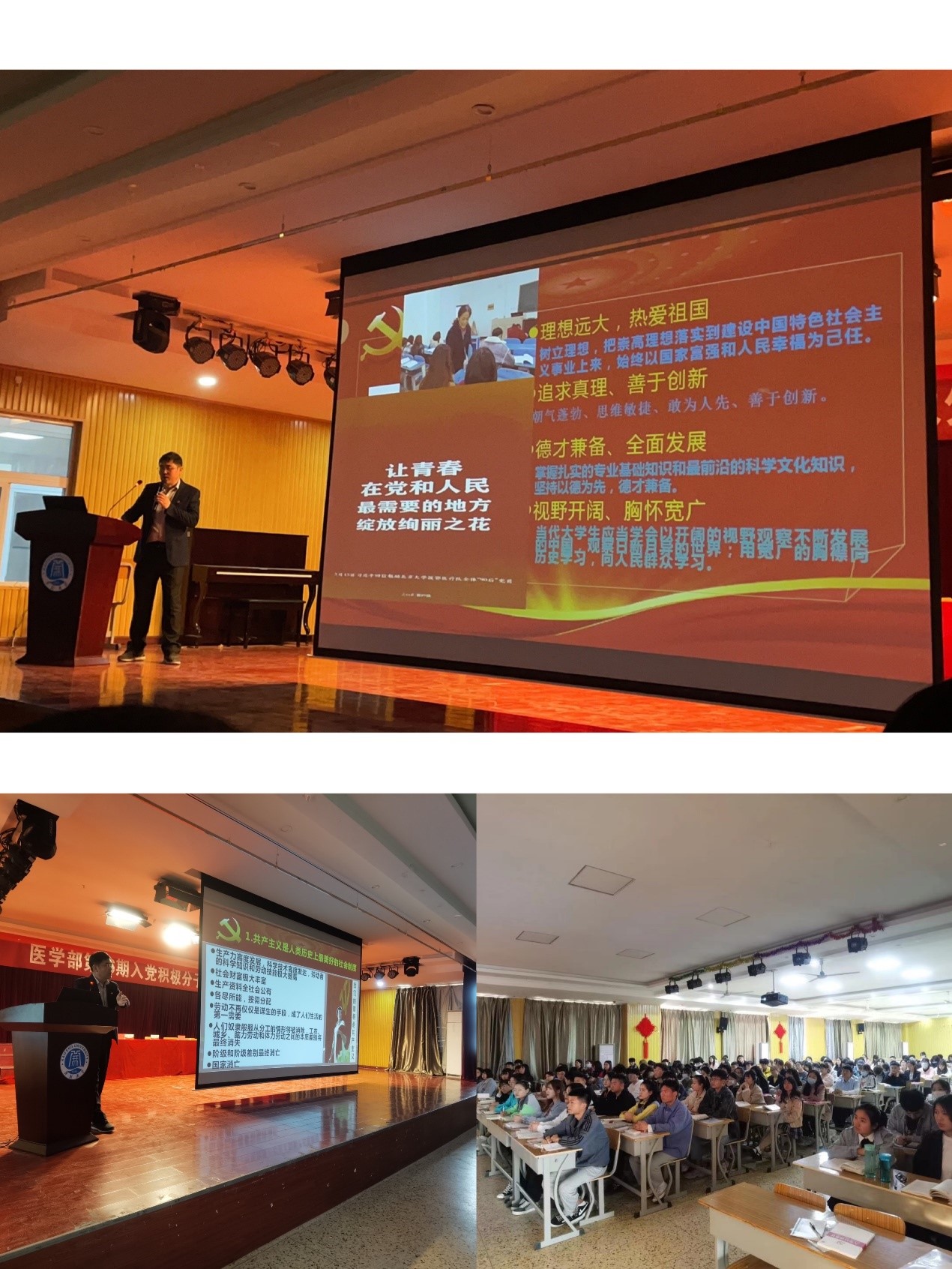 开班仪式结束后,365英国上市集团官网组织统战部赵海胜同志开展了医学部第十六期入党积极分子第一次党课培训。带领大家深入了解习近平新时代中国特色社会主义思想及党的十九大精神,引导同学们在党史学习中不忘初心、牢记使命,努力做到与人民同呼吸,共命运,把人民对美好生活的向往作为奋斗目标。在培训课上,学员们认真听课,奋笔疾书,进一步展现了积极分子的风貌,通过此次培训使入党积极分子们对党有了更深层次的了解,从源头上保证发展党员质量具有十分重要的意义,为进一步巩固和扩大党员队伍的后备力量夯实了基础。