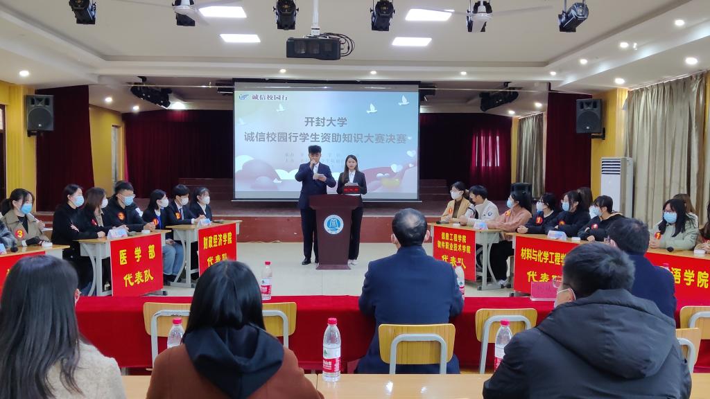 前期经过广泛宣传动员,各院部通过初赛,复赛的精彩角逐最终6支参赛队伍进入决赛,分别是医学部、人文学院、材料与化学工程学院、财政经济学院、信息工程学院/软件职业技术学院、外国语学院。本次比赛采用现场竞赛、现场抽签、现场评比、现场颁奖的方式进行。本次赛程分为五个环节,个人必答题、第一轮抢答题、集体必答题、第二轮抢答题和风险题。比赛过程中,各个参赛团队齐心协力,紧密围绕诚信与资助主题,展现了开大学子的团结协作、沉着冷静、勇于进取的精神风貌。在风险题中,各院部参赛选手不仅展现了良好的随机应变能力,而且体现了团队间的默契配合。