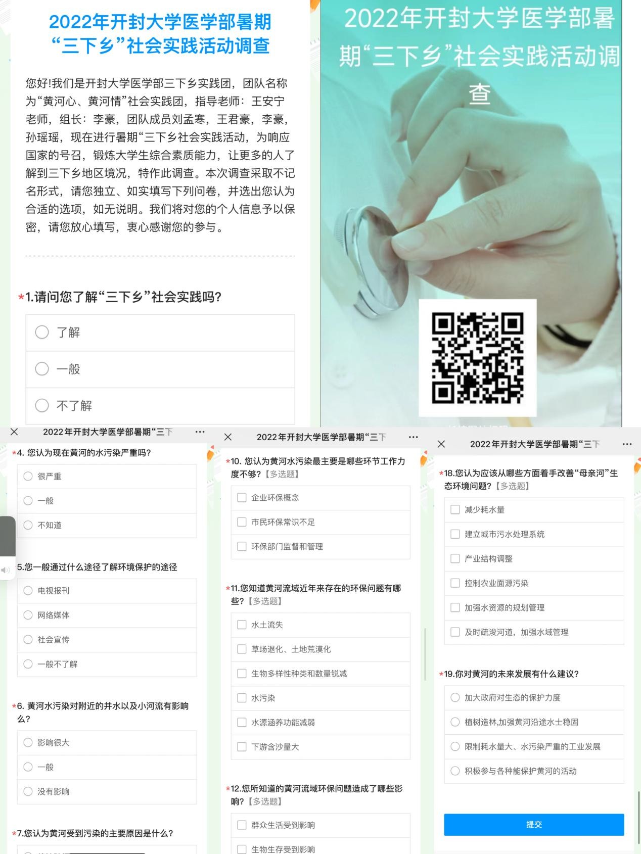 为深入学习宣传贯彻习近平总书记在黄河流域生态保护和高质量发展座谈会上的重要讲话精神,落实绿色发展理念,推进生态文明建设,引导青少年积极参与保护母亲河志愿服务行动,医学部开展了“黄河心”、“黄河情”社会实践团暑期“三下乡”活动,在指导教师王安宁、组长李豪及团队成员孙瑶瑶、刘孟寒、王君豪的分工合作下,于6月22日开始在河南省黄河渡口浮桥开封段和封丘县段进行了暑期“三下乡”社会实践。