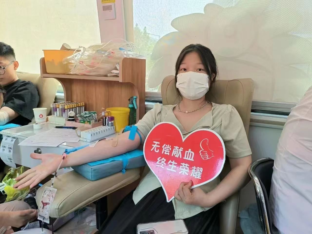 献血车内,同学们积极配合医护人员进行初筛检验、采集血样等工作,符合献血条件的同学依次进入献血车,有序进行献血。此外,医护人员也备有营养补给品,确保献血者在献出爱心的同时,保障其自身身体健康。
