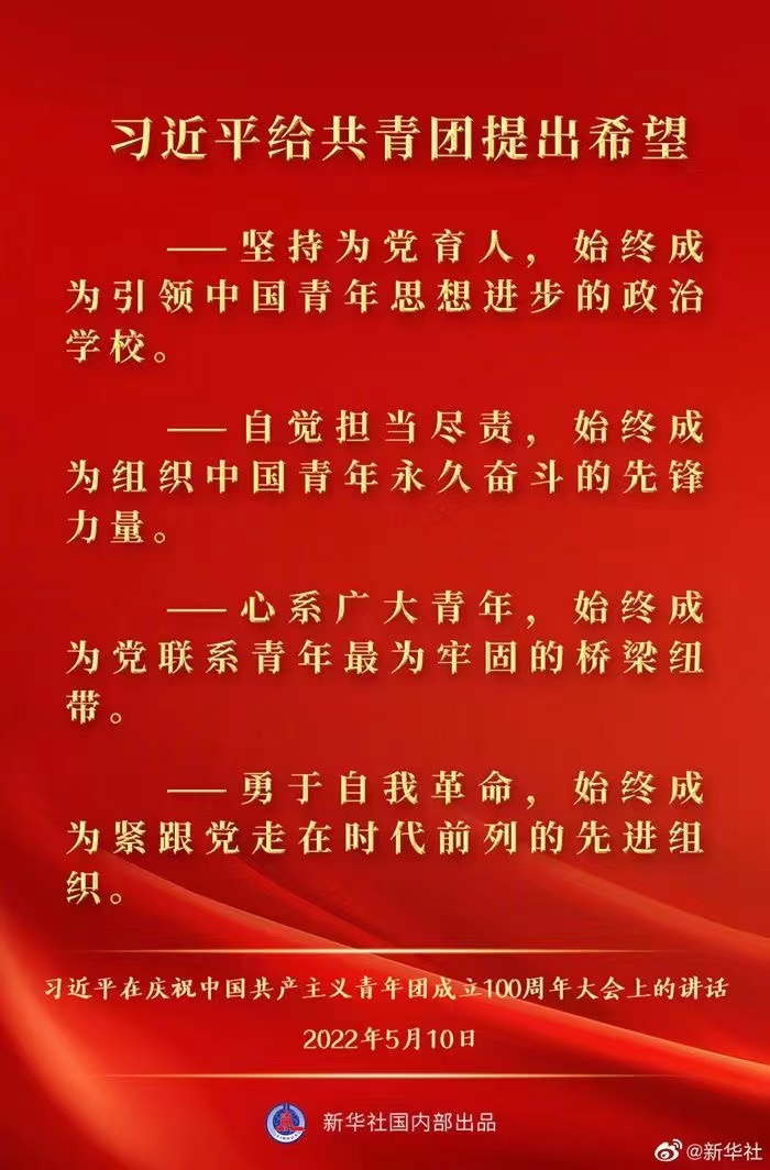 庆祝中国共产主义青年团成立100周年大会5月10日上午在北京人民大会堂隆重举行。中共中央总书记、国家主席、中央军委主席习近平出席大会并发表重要讲话。 中共中央总书记、国家主席、中央军委主席 习近平在庆祝中国共产主义青年团成立100周年大会上的讲话.pdf