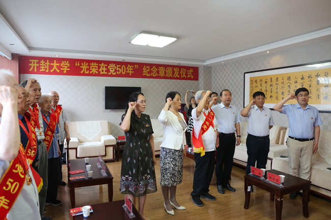 党委书记陈灿为参加仪式的6名党龄50年以上的老党员代表逐一颁发佩戴纪念章、绶带和贺卡,并带领现场全体党员,面向鲜红的党旗,重温了入党誓词,进一步坚定初心使命,汲取奋进力量。学校领导将通过走访慰问为其他7名党龄50年以上的老党员颁发纪念章、绶带和贺卡。