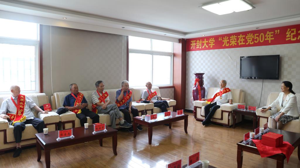 校党委书记陈灿为6名党龄50年以上的老党员代表逐一颁发佩戴纪念章、绶带和贺卡并进行座谈